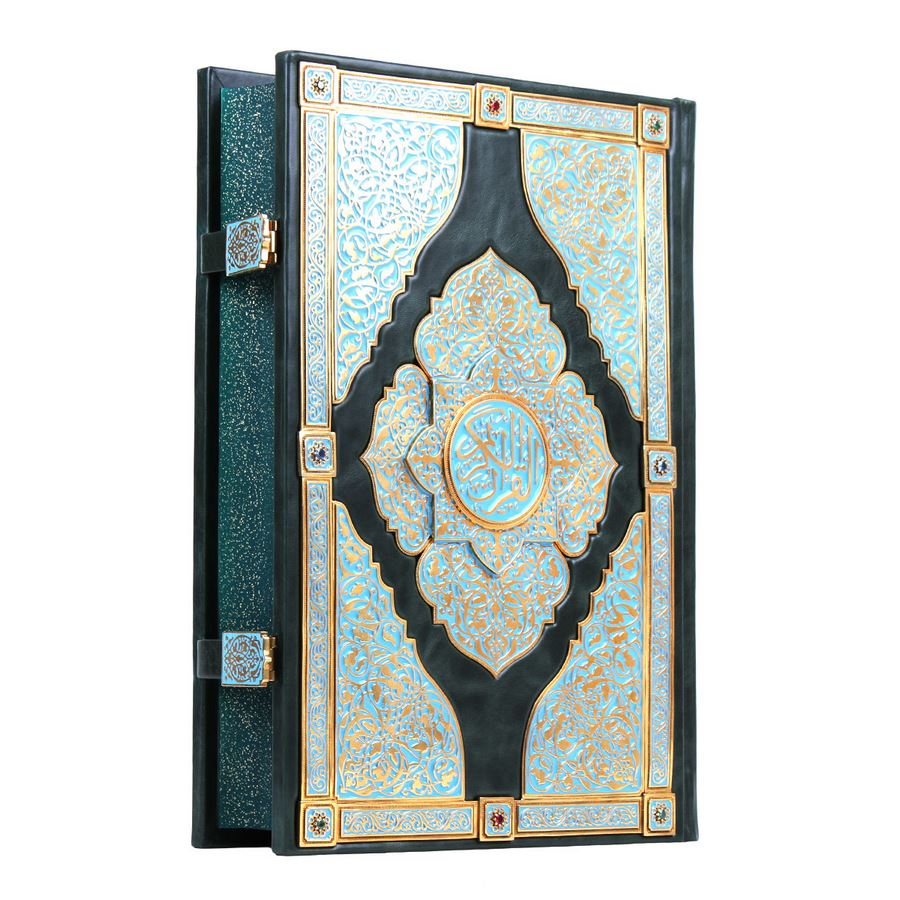 Текст Корана полностью каноничен. Оформление выполнено с глубоким уважением к содержанию, используя классические для исламского искусства орнаменты и материалы.