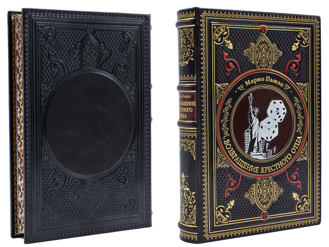 Подарочное издание книги Марио Пьюзо представляет собой образец книжного искусства. Кожаный переплет украшен сложным тиснением с применением цветных фольг и рельефных элементов. Блок книги отшлифован до гладкости, страницы тонированы в теплый оттенок слоновой кости и дополнены классическим орнаментом. Текст отпечатан на плотной немецкой бумаге Ozon Ivory, которая обеспечивает четкость шрифта и долговечность страниц. Каждый экземпляр создан для коллекционирования и демонстрации в домашней библиотеке. Внешний вид книги говорит о высоком статусе издания и его владельца.