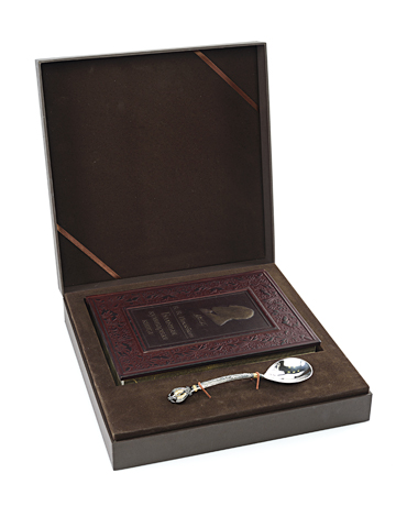 - Достойное оформление: Тиснение выполнено серебром 925° пробы (средний вес 63 г), что гарантирует его сохранность на десятилетия.