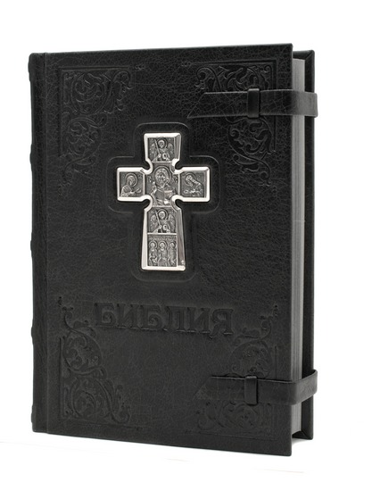 Библия в кожаном переплете с серебряным окладом и защитный фирменный чехол.